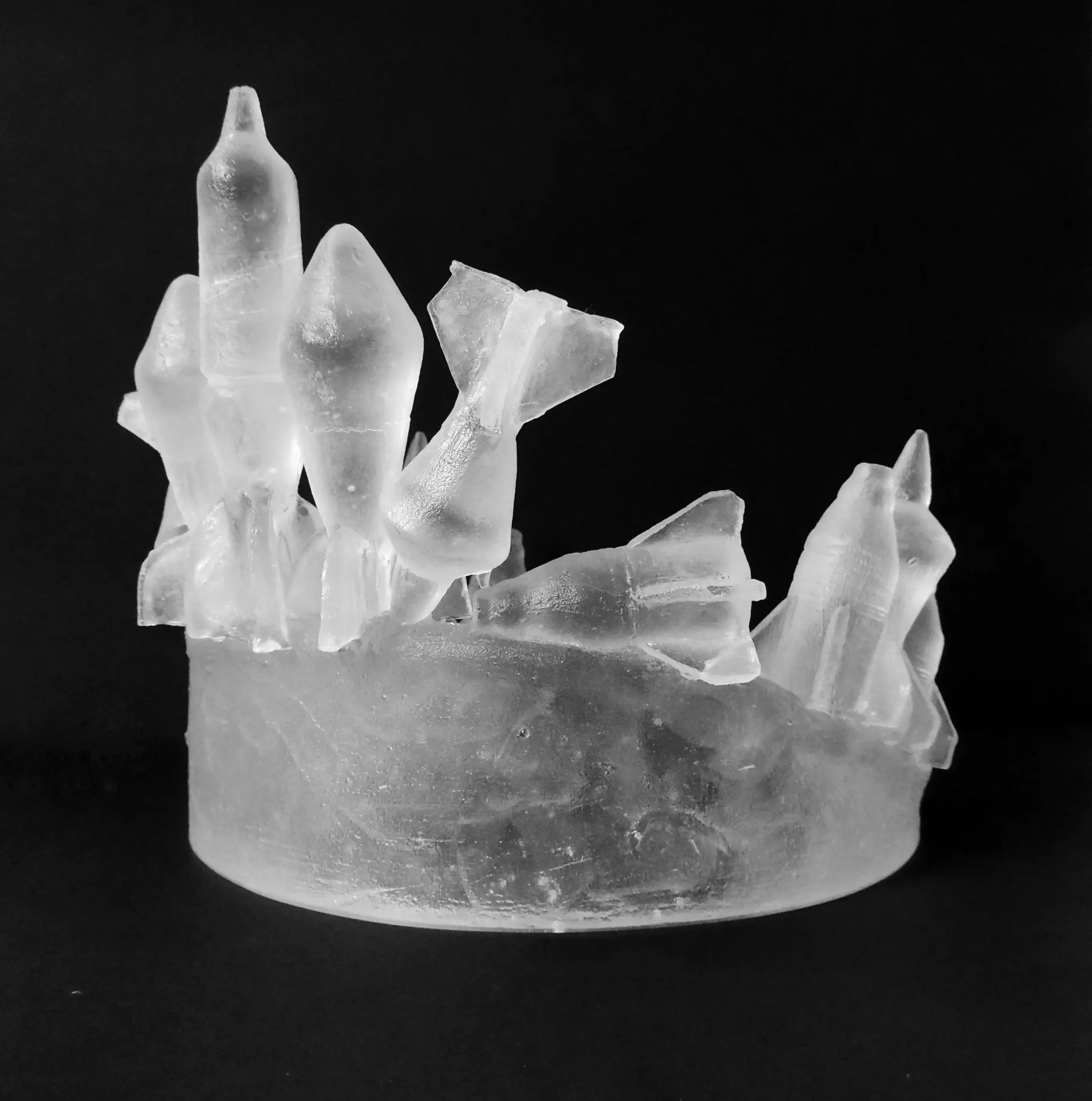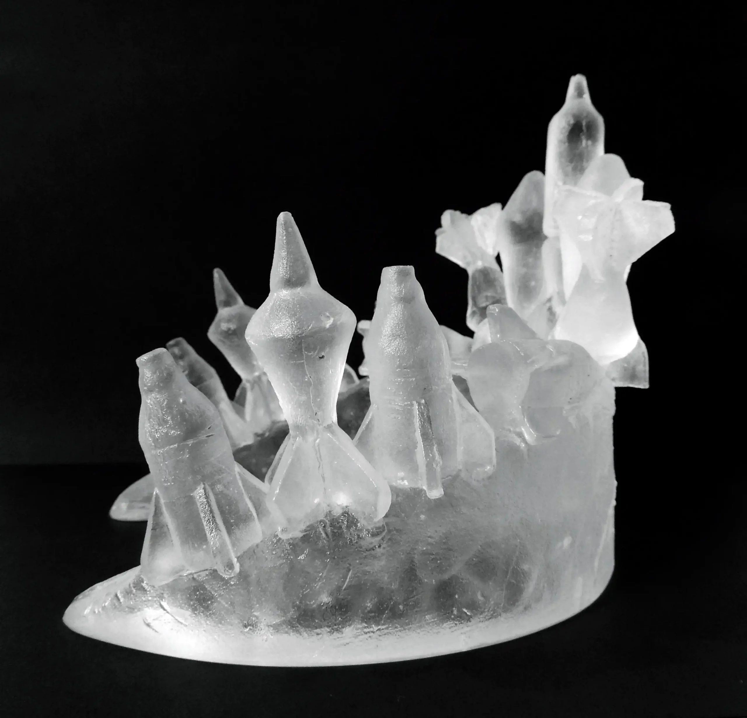 « Crown » sous le prisme de la guerre, mêle deux éléments symboliques forts. Elle en dénonce les dérives d’une expérience traumatique résultant des conflits qui ont forgé l’environnement contemporain. L’association de la couronne, symbole de toute puissance et de pouvoir avec l’emploi de bombes, symbole de violence et de destruction fait écho au contexte socio-politique du monde, nous questionnant sur l’avancée de l’homme ou plutôt son déclin. L’oeuvre délaisse les joyaux et se pare d’ogives qui semblent glorifier la représentation de faits de guerre. Donnant lieu à des réflexions esthétiques, car très tôt dans l’histoire de l’humanité la guerre a sollicité les arts, représentée sur les sculptures, les monnaies, les vases, les peintures, dans les chansons ou la littérature…
